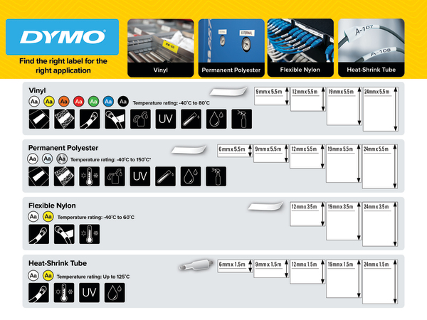 - Met de exclusieve sneltoetsen van DYMO drukt u automatisch labels met vaste afmetingen, spatiëring en opmaak af voor kabels en snoeren, modules, terminalblocks en schakelpanelen, met verticale opmaak of vaste lengte.